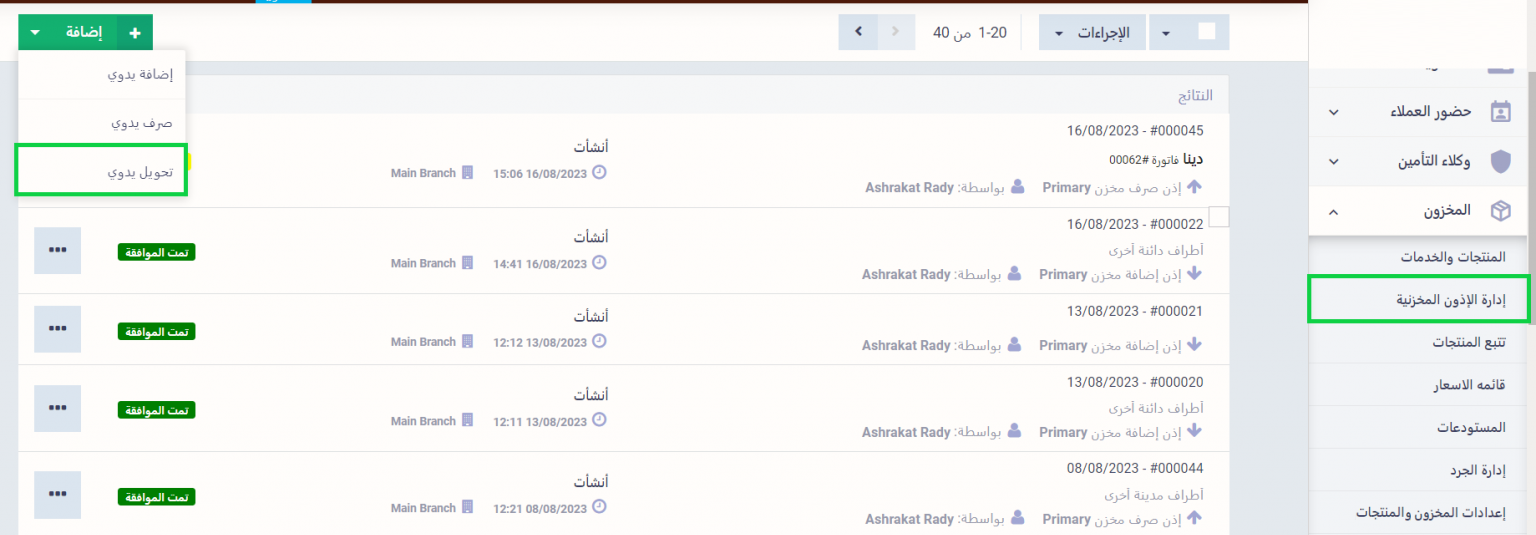 اضغط على “إدارة الأذون المخزنية” المنسدلة عن “المخزون” بالقائمة الرئيسية، ثم اضغط على زر إضافة واختر من القائمة المنسدلة “تحويل يدوي”.