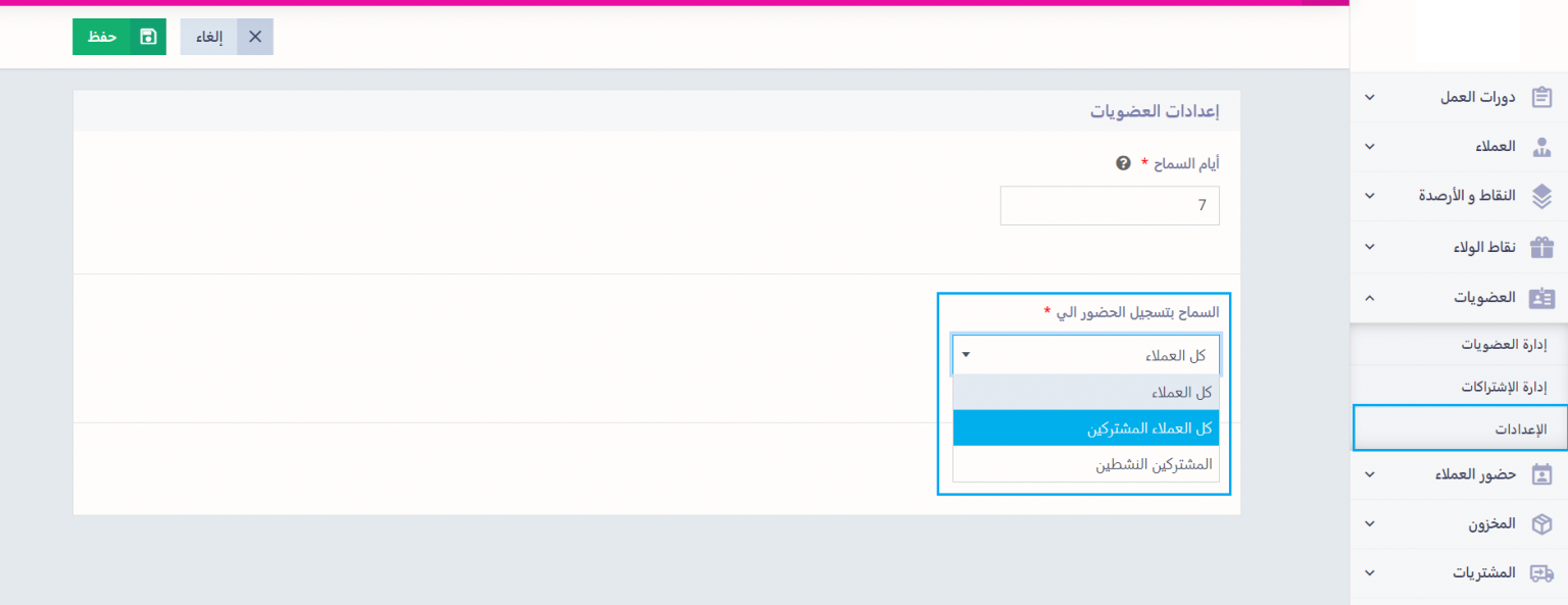 يمكنك التحكم في العملاء المسموح تسجيل حضورهم من خلال الضغط على “الإعدادات” المنسدلة عن “العضويات” بالقائمة الرئيسية، والاختيار من القائمة المنسدلة عن حقل “السماح بتسجيل الحضور إلى”: