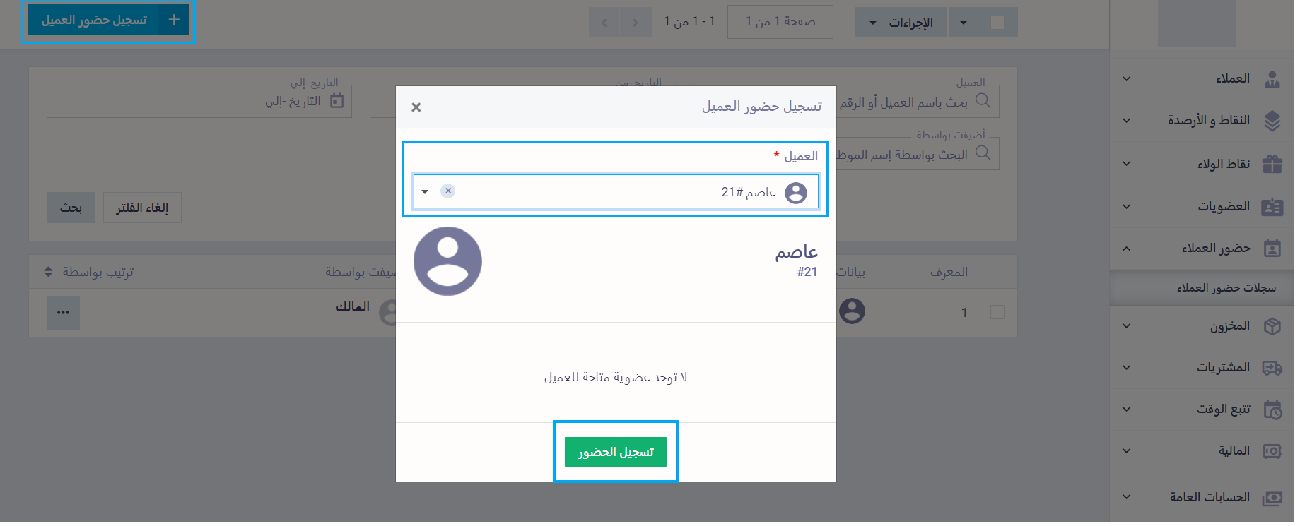 اختر العميل المراد تسجيل حضوره من القائمة المنسدلة عن حقل “العميل”، ثم اضغط على زر “تسجيل الحضور”