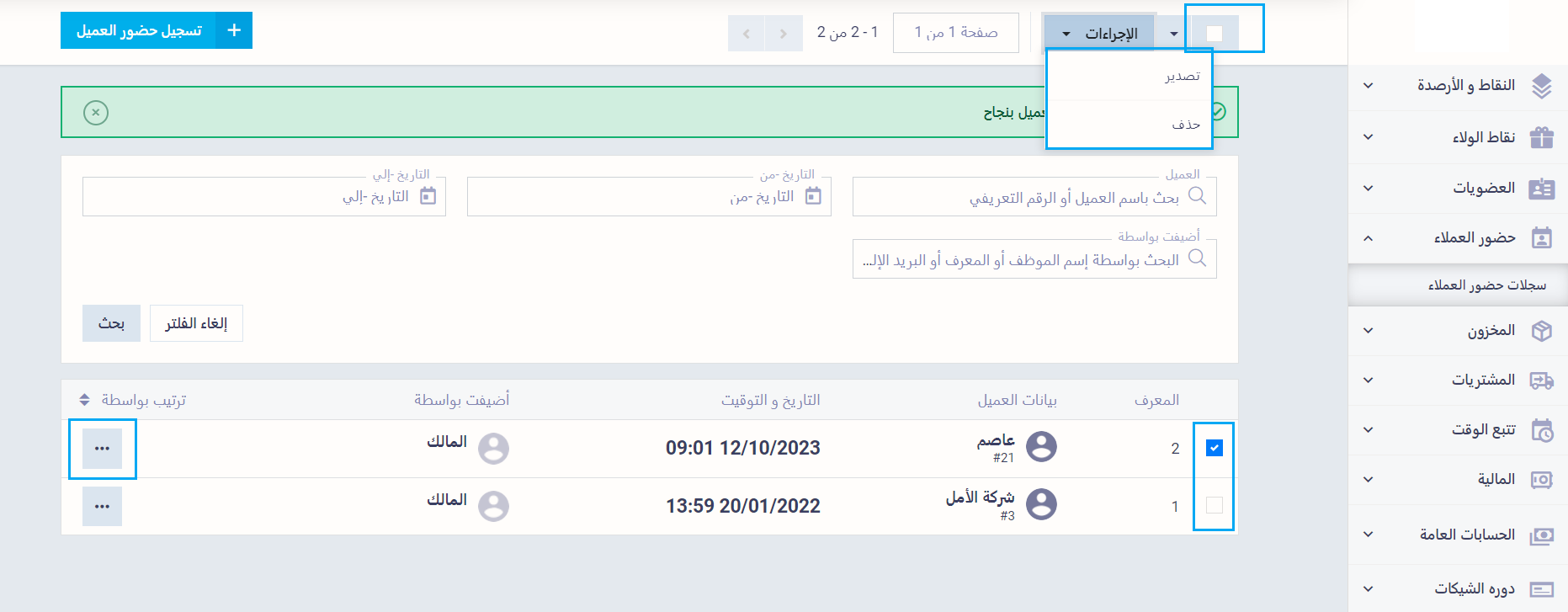 بعد تحديد تسجيلات حضور العملاء المراد تصديرها، اضغط على زر “الإجراءات” ثم اضغط “تصدير”