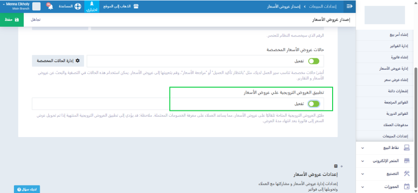تفعيل إعداد تطبيق العروض على عروض الأسعار