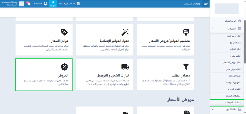 اضغط على “إعدادات المبيعات” المنسدلة عن “المبيعات” بالقائمة الرئيسية ثم اضغط على “العروض”.