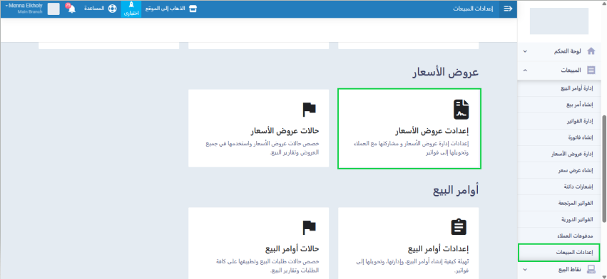 اضغط على “إعدادات المبيعات” المنسدلة عن “المبيعات” بالقائمة الرئيسية ثم اضغط على “إعدادات عروض الأسعار”.