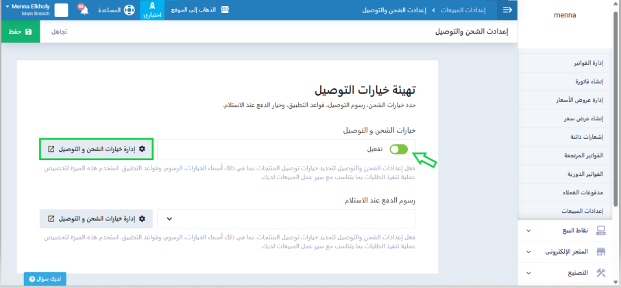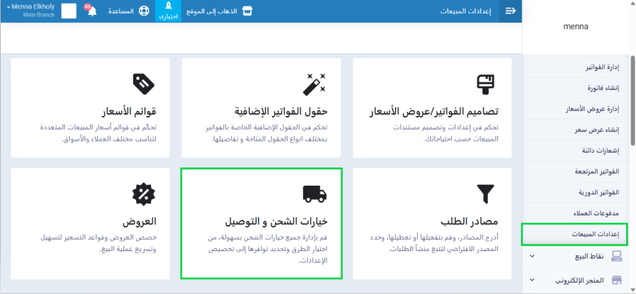 من “إعدادات المبيعات” المنسدلة عن المبيعات بالقائمة الرئيسية، اضغط على “خيارات الشحن والتوصيل”.