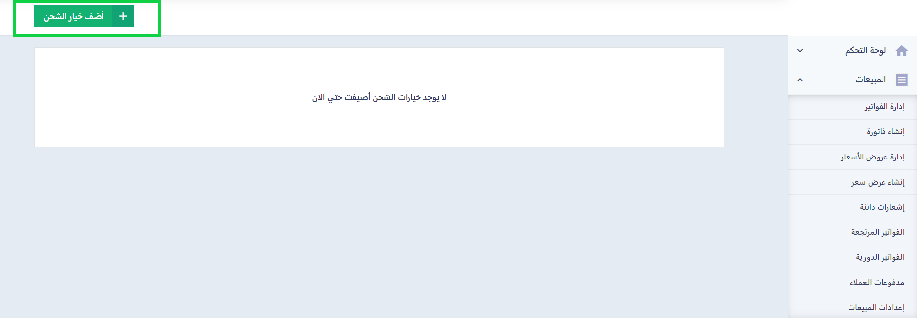 سينقلك النظام تلقائيًا إلى شاشة إدارة خيارات الشحن. اضغط على “أضف خيار الشحن” لبدء إضافة خيار شحن جديد.