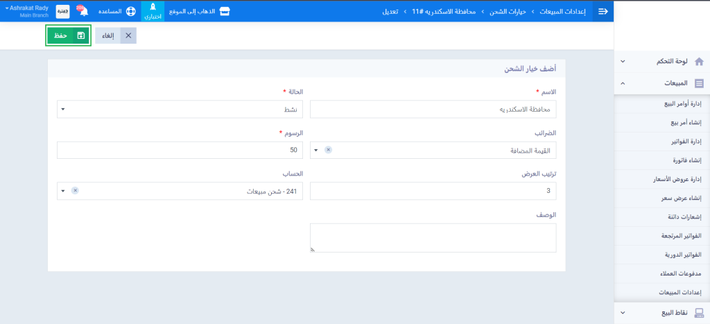 - ترتيب العرض يقصد به أولوية ظهور هذا الخيار ضمن الخيارات الأخرى التي تنسدل من قائمة خيارات الشحن بالفاتورة.