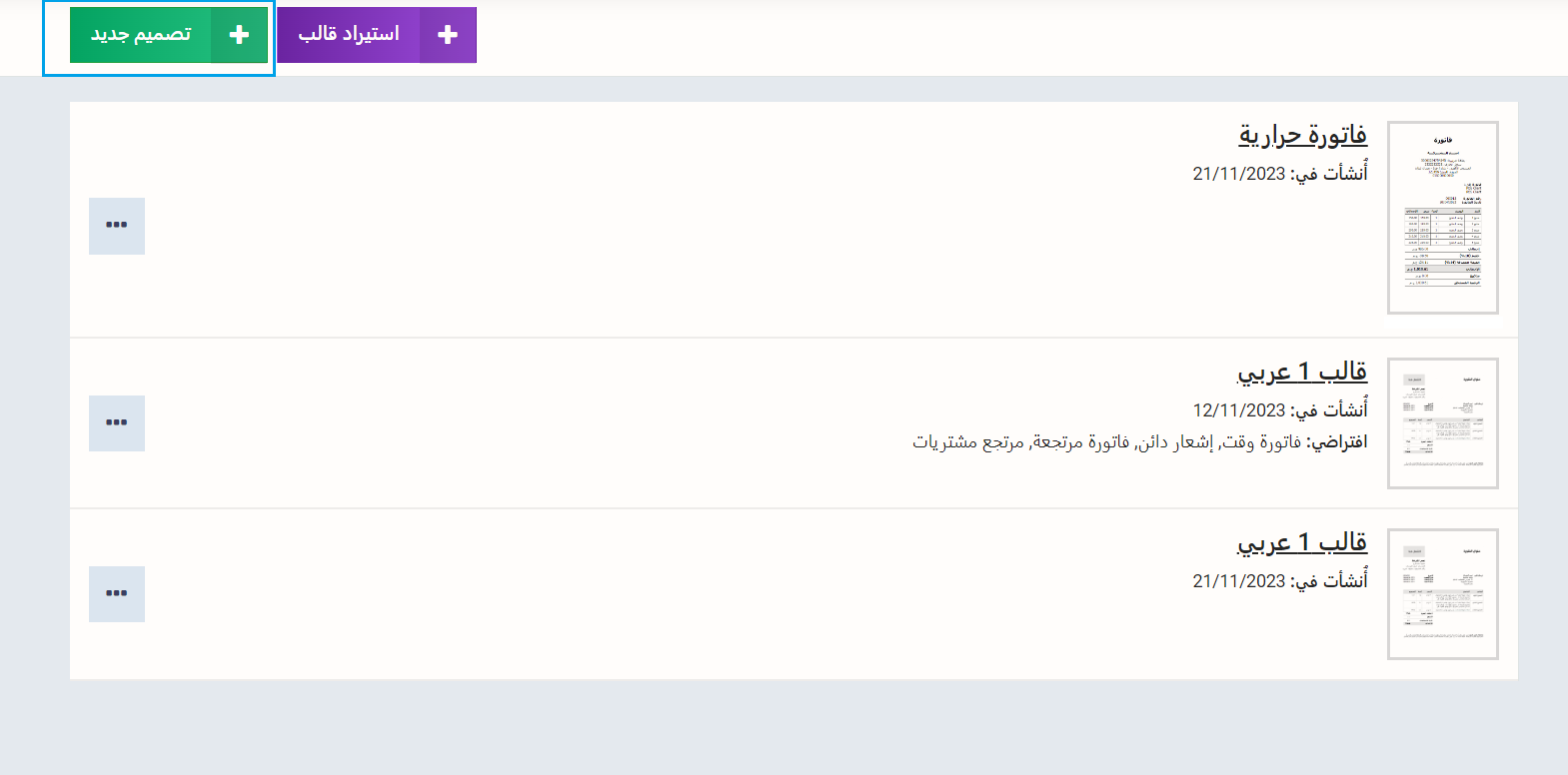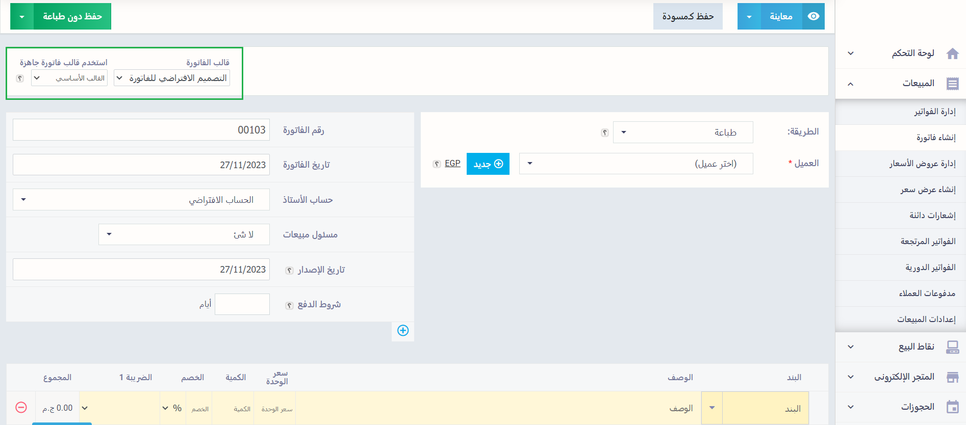 عند إنشاء فاتورة أو مستند جديد يظهر القالب الذي جعلته افتراضيًا لهذا المستند، ويمكنك تغييره من القائمة المنسدلة عن حقل “قالب الفاتورة”.