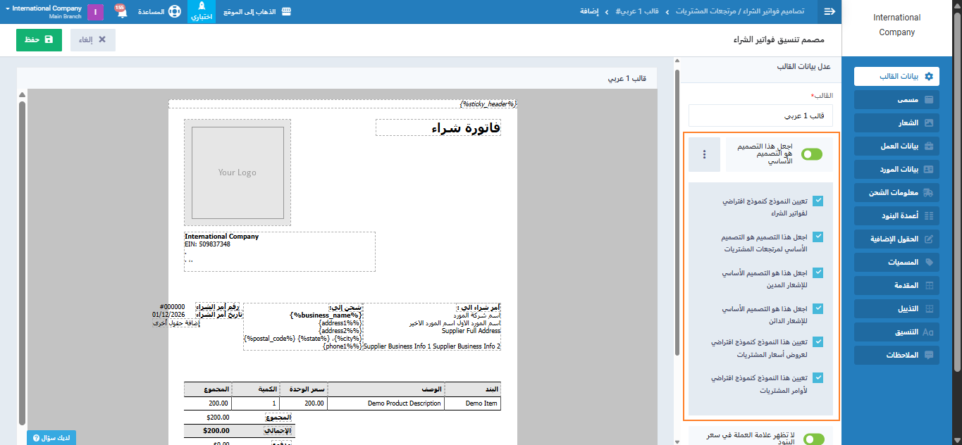 يمكنك أن تجعل قالب الفاتورة (أ) أساسي لفواتير المشتريات بينما تجعل قالب الفاتورة (ب) لمرتجعات المشتريات لتمييز شكل كل مستند من مستندات دورة المشتريات لديك، وبالمثل مع مستندات المبيعات.