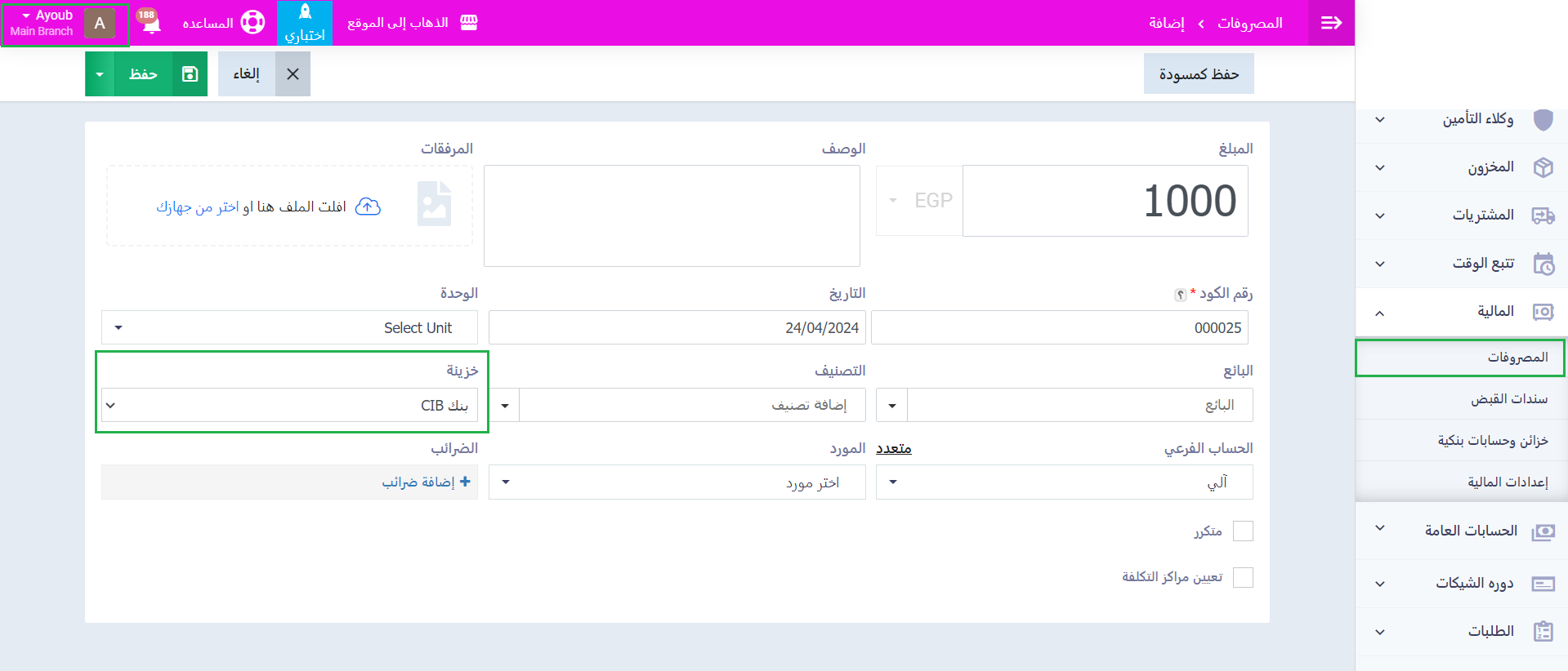 توجه لإنشاء مصروف أو سند قبض، لتجد الخزينة/ الحساب البنكي المعيّن افتراضيًا نفس البنك الذي قمت بجعله افتراضيًا له.