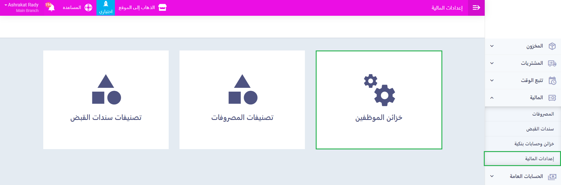 لإضافة الخزينة الافتراضية للموظف اضغط على “إعدادات المالية” المنسدلة عن “المالية” بالقائمة الرئيسية ثم اضغط على “خزائن الموظفين”.