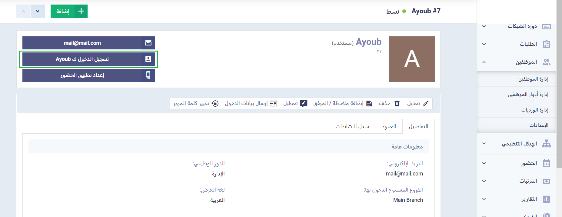 اذهب للملف الشخصي للموظف واضغط على زر “تسجيل الدخول كـ (اسم الموظف)”