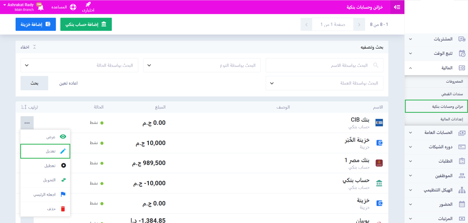 أولًا ينبغي عليك التأكد من منح هذا الموظف صلاحية الوصول لهذه الخزينة أو الحساب البنكي، وذلك بالضغط على “خزائن وحسابات بنكية” المنسدلة عن “المالية” بالقائمة الرئيسية ثم الضغط على زر “تعديل” للحساب البنكي أو الخزينة المراد تعيينها للموظف.