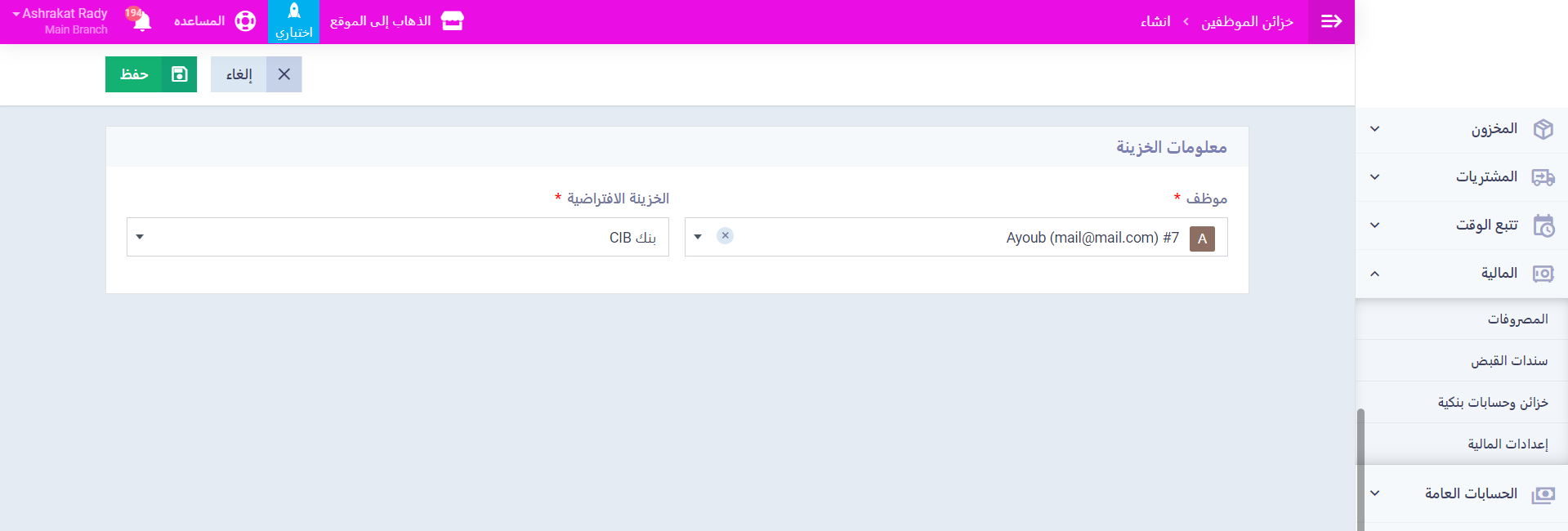 حدد الموظف المراد والخزينة أو الحساب المراد تعيينهم له ثم اضغط على زر “حفظ”.