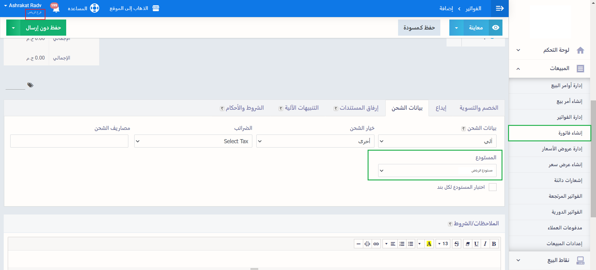 عند إنشاء فاتورة في هذا الفرع نفسه نجد في“بيانات الشحن” المستودع الافتراضي هو نفسه المستودع الذي تم تعيينه كافتراضي لهذا الفرع، في هذا المثال يظهر “مخزن فرع الرياض” كافتراضي .