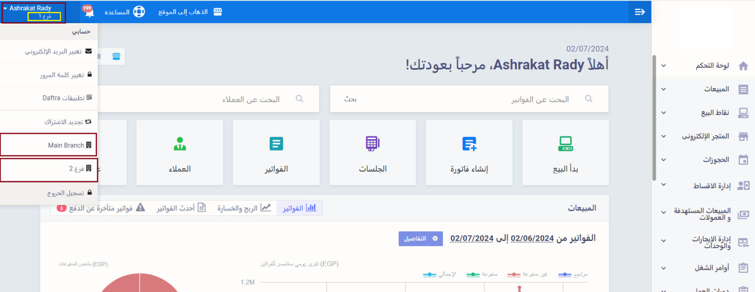لتعيين مستودع افتراضي لفرع محدد، تأكد من اختيار الفرع المراد في حسابك على دفترة قبل الانتقال لضبط الإعدادات، ويتم اختيار الفرع من خلال الضغط على اسم الحساب الخاص بك، لتظهر قائمة منسدلة تتضمن الفروع المضافة لديك على النظام، كل ما عليك أن تضغط على الفرع المراد ليتم تحويلك عليه.