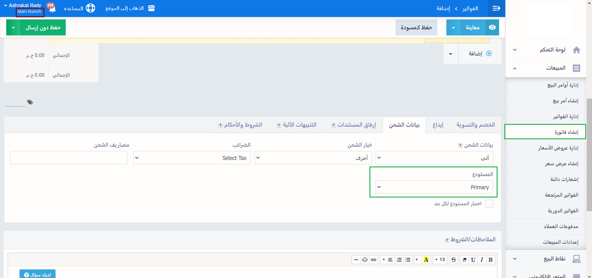 عند إنشاء فاتورة في هذا الفرع نفسه نجد في“بيانات الشحن” المستودع الافتراضي هو نفسه المستودع الذي تم تعيينه كافتراضي لهذا الفرع، في هذا المثال يظهر المستودع الرئيسي Primary.
