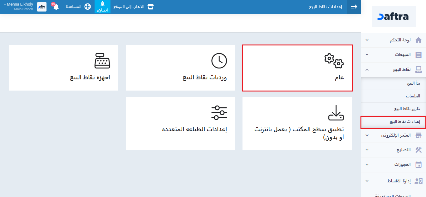 من القائمة الرئيسية، اضغط على “نقاط البيع “، ثم من القائمة المنسدلة اختر “إعدادات نقاط البيع”. اضغط على .“الإعدادات العامة”