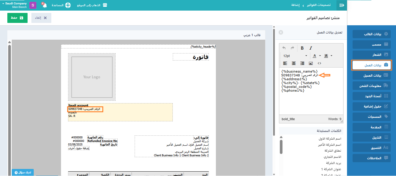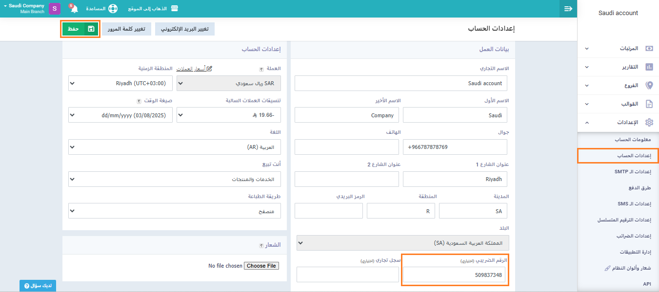 في حال قامت الشركة بتحديث رقمها الضريبي، يمكن للمستخدم تعديل الرقم الضريبي داخل النظام دون التأثير على الفواتير السابقة، حيث يمكن للنطام ان يُحافظ على الرقم الضريبي القديم في جميع الفواتير التي تم إصدارها قبل التعديل. اتبع الخطوات التالية: