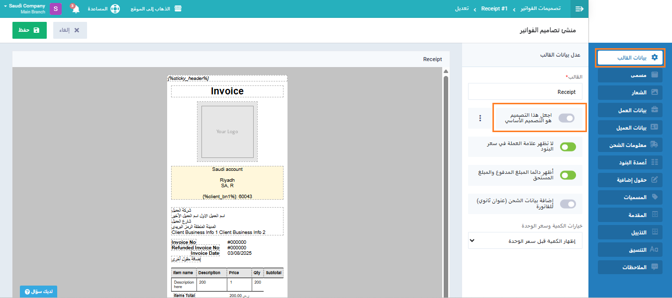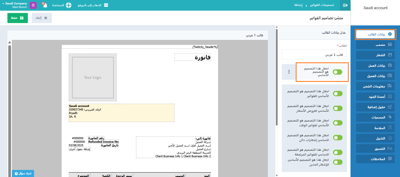 ثم من بيانات القالب تأكد من تفعيل “اجعل هذا التصميم هو التصميم الأساسي“, واضغط على زر “حفظ”.
