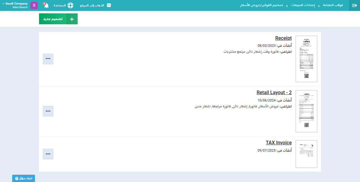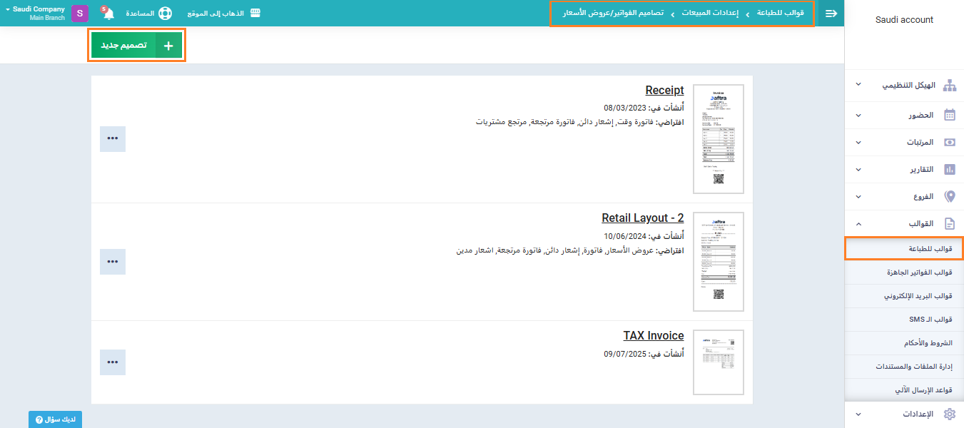 نعود للتوجه لقوالب الطباعة ثم “تصاميم الفواتير/عروض الأسعار“, اضغط على زر “تصميم جديد“.