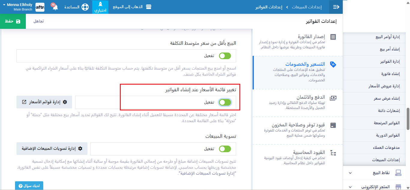 قبل البدء توجه إلى “إعدادات المبيعات” ثم اضغط “إعدادات الفواتير“، للتأكد من تفعيل إعداد “تغيير قائمة الأسعار عند إنشاء الفواتير“