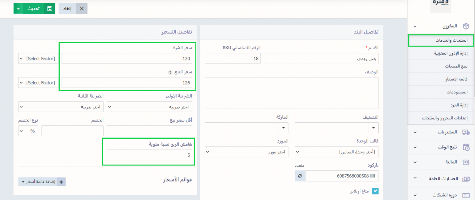 انتقل بعدها لتفاصيل التسعير واكتب نسبة هامش الربح التي تريدها لهذا المنتج، أو قم بتحديد سعر البيع والشراء ليحتسب لك دفترة نسبة هامش الربح تلقائيًا، ثم اضغط على زر “حفظ” أو “تحديث”.