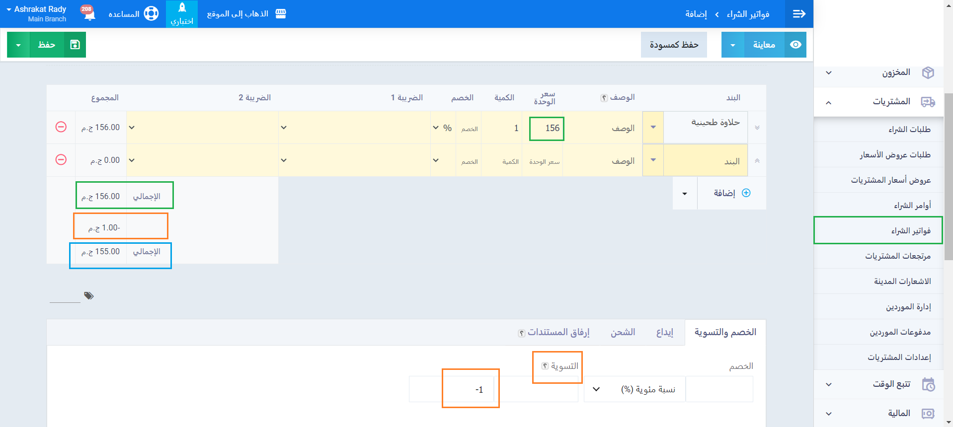 نكتب في مربع التسوية الرقم الذي نريد حذفه أو إضافته من الفاتورة لكي يصبح الإجمالي رقم صحيح، ويكون مبلغ التسوية بالقيمة الموجبة (+) إن كنت ستضيف مبلغ تتحمله زيادة على إجمالي فاتورة الشراء.