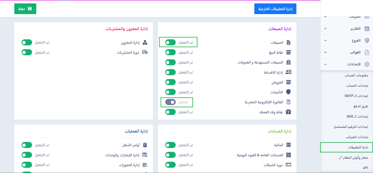 اضغط على “إدارة التطبيقات” المنسدلة عن “الإعدادات” بالقائمة الرئيسية وفعّل الزر بجوار التطبيق المراد استخدامه، أو ألغي تفعيل التطبيقات المراد التوقف عن استخدامها ثم اضغط على زر “حفظ” لتظهر لك التطبيقات المفعّلة بالقائمة الجانبية للحساب.