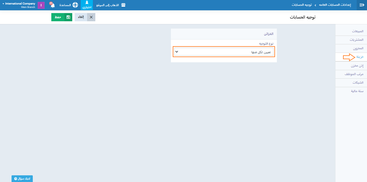 توجيه الخزينة إلى حساب معين في دليل الحسابات