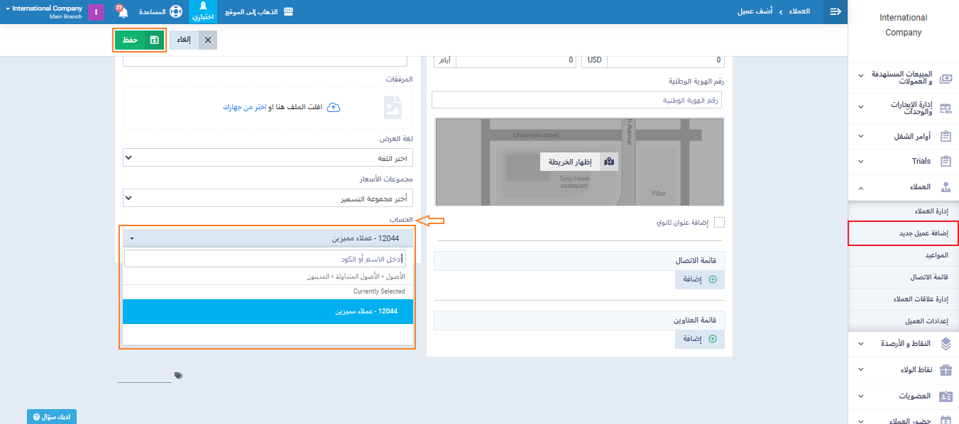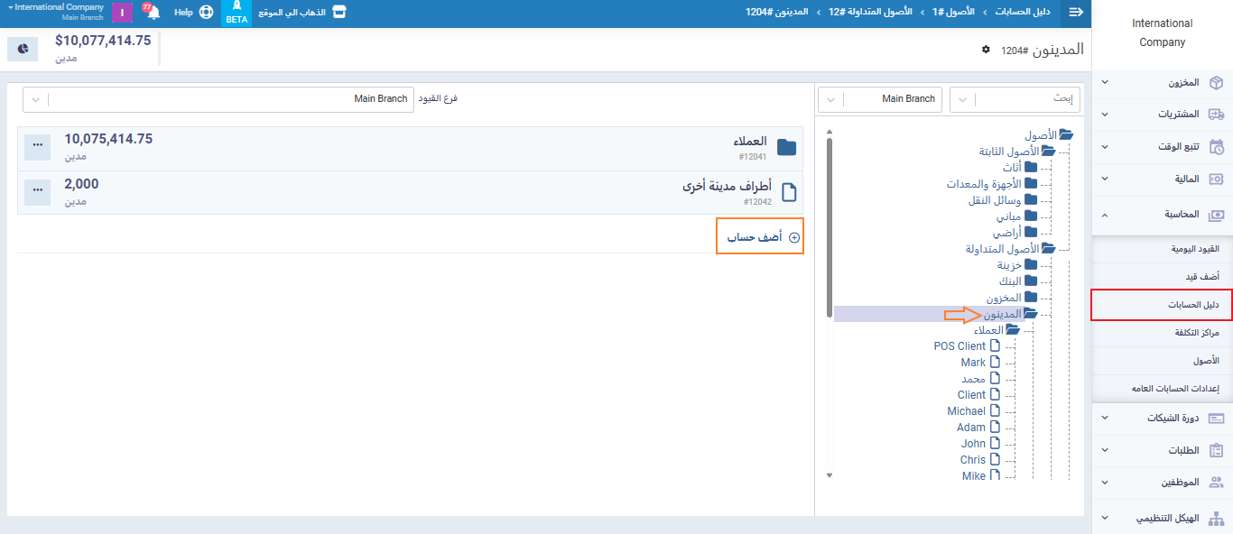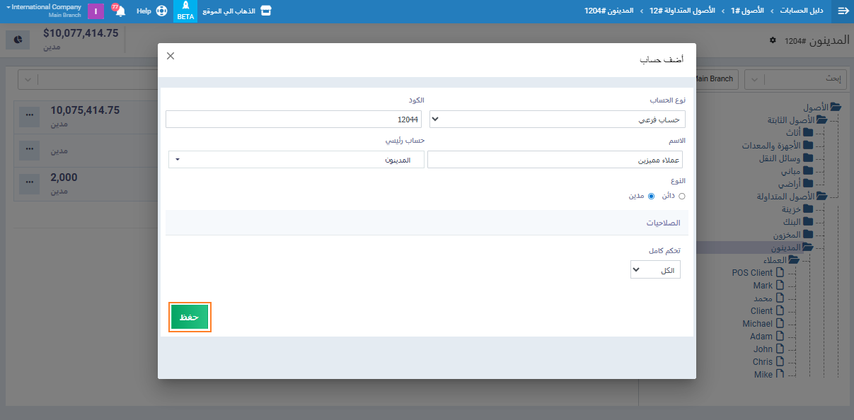 يتيح لك النظام إضافة حساب جديد داخل دليل الحسابات ليكون مخصصًا لمعاملات عميل معين أو لمجموعة محددة من العملاء. بعد ذلك يمكنك ربط هذا العميل بالحساب الذي أنشأته مسبقًا، مما يساعدك على متابعة جميع معاملاته المالية بشكل دقيق، وضمان تسجيلها في الحساب الصحيح.