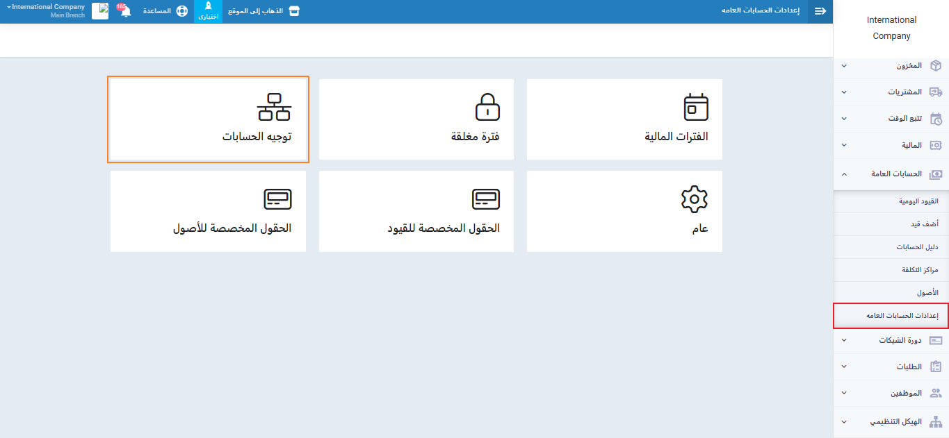 اضغط على “المحاسبة“, ثم اضغط “إعدادات الحسابات العامة“. اختر “توجيه الحسابات“.