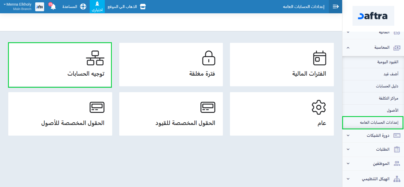 يتم توجيه الحسابات في نظام دفترة عبر إعدادات الحسابات العامة، لذلك تأكد من تفعيل تطبيق الحسابات العامة في حسابك حتى تتمكن من اتخاذ هذا الإجراء.