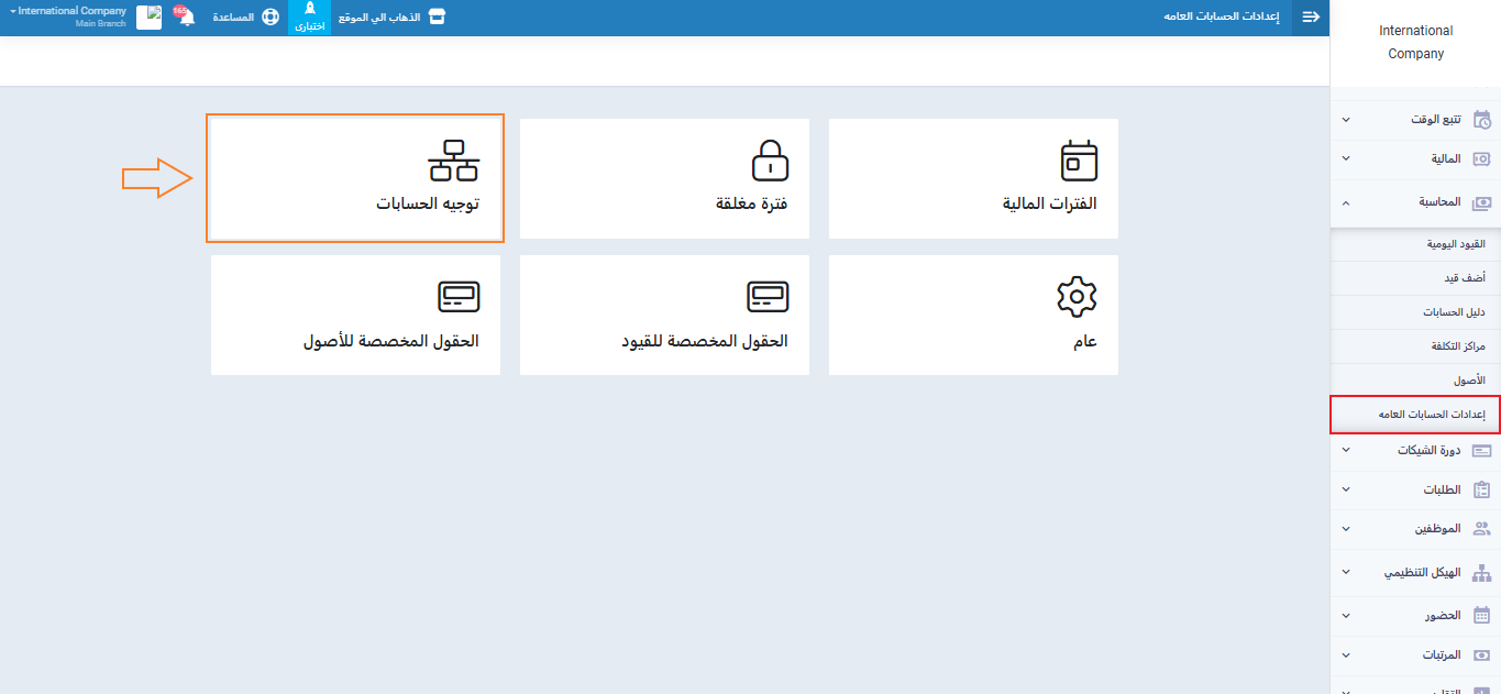 ولكي يتيح النظام اختيار حساب آخر لتوجيه فواتير المشتريات منه يجب تهيئة إعدادات توجيه حسابات المشتريات أولًا، وذلك بالضغط على “إعدادات الحسابات العامة” المنسدلة عن “الحسابات العامة” بالقائمة الرئيسية ثم الضغط على بطاقة “توجيه الحسابات”.