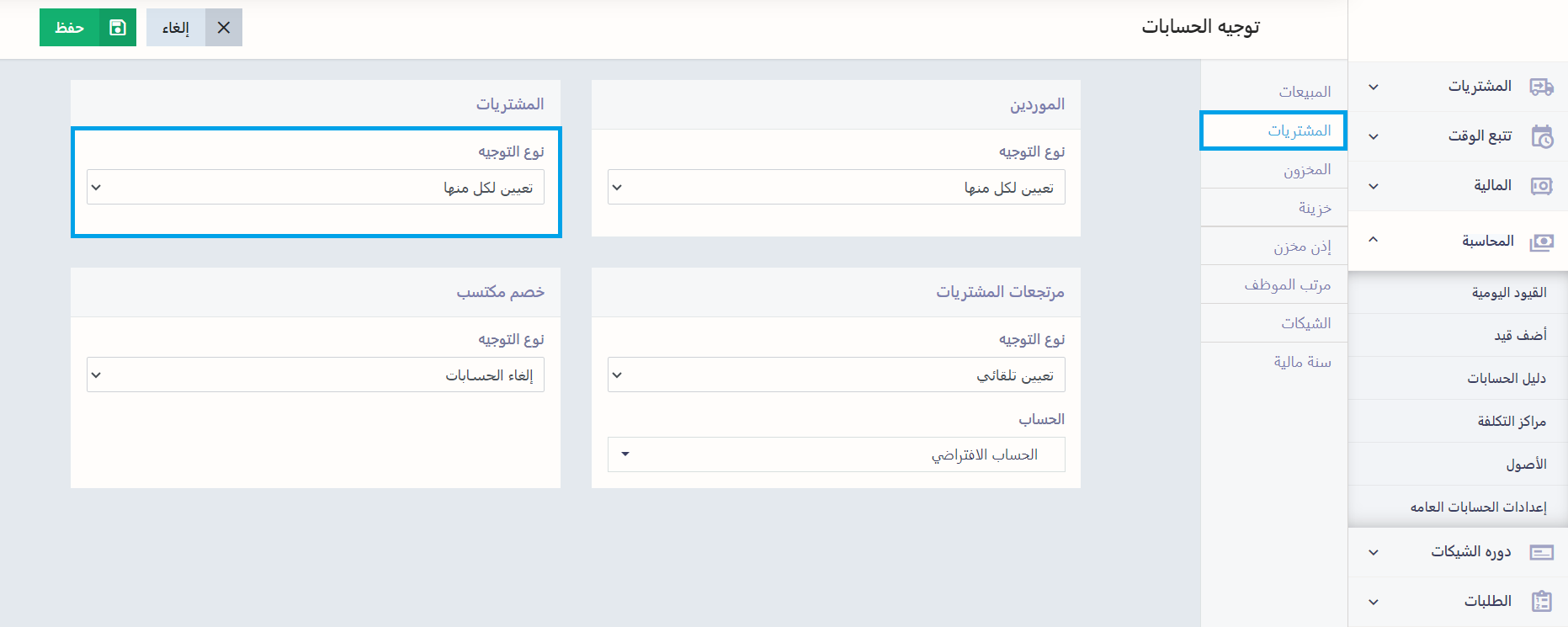 ضبط الإعدادات اللازمة لتوجيه حساب المشتريات
