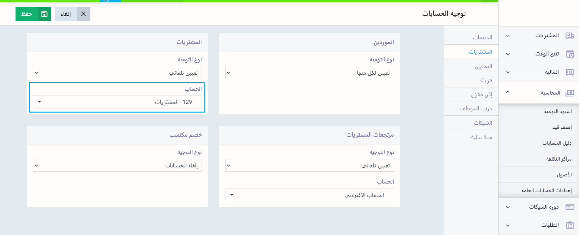 تجد عند الحسابات المتعلقة بالمشتريات الإعداد الافتراضي لنوع التوجيه “تعيين تلقائي”، حيث الحساب “المشتريات” افتراضيًا.