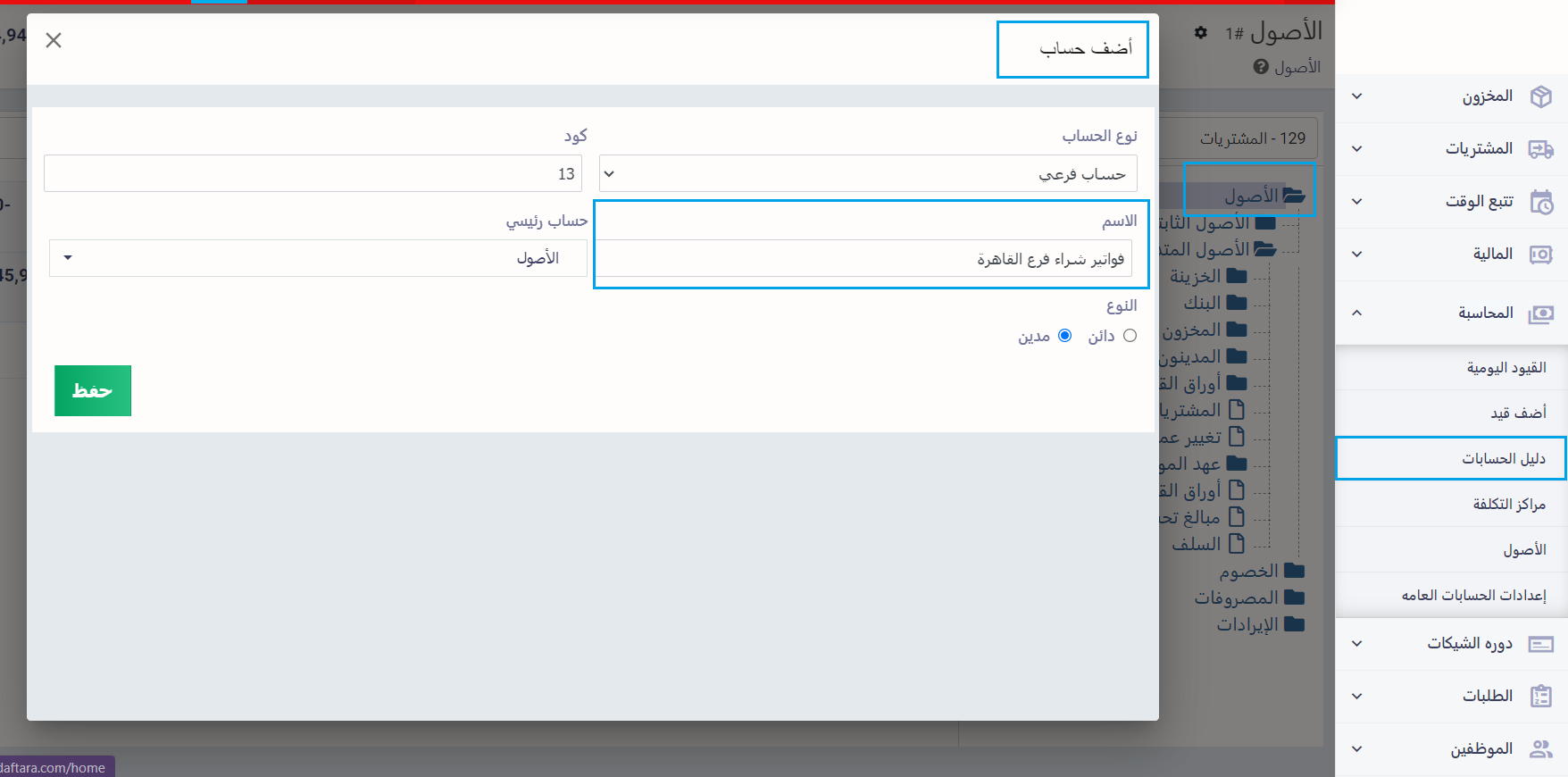 اضغط على “دليل الحسابات” المنسدلة عن “الحسابات العامة” بالقائمة الرئيسية. واضغط على الحساب المراد تفريع الحساب الجديد منه واضغط على “+ أضف حساب” واكتب اسم الحساب الجديد وليكن “فواتير شراء فرع القاهرة” لفصل حسابات المشتريات الخاصة بهم عن باقي الأفرع، قم اختر الحساب الرئيسي المنرد عنه الحساب واضغط “حفظ”.