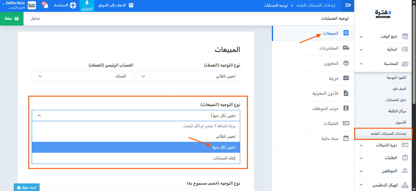بعد التأكد من تفعيل كلٍ من تطبيق المبيعات وتطبيق الحسابات العامة، قم بضبط نوع توجيه الحساب ليكون “تعيين لكلٍ منها” بدلًا من “تعيين تلقائي“؛ وذلك لأن النظام لا يتيح ميزة توجيه الحساب افتراضيًا، وإنما ينبغي عليك أن تُخطر النظام بأن يتيح لك خيار توجيه الحساب في شاشة الفاتورة.