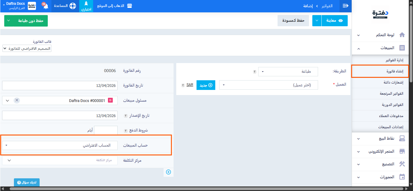 فلنفترض أننا نريد توجيه حساب فاتورة مبيعات للعميل أنس إلى حساب “مبيعات الفرع الرئيسي” بدلًا من حساب “المبيعات” الافتراضي. ولإتمام ذلك نقوم بالآتي: