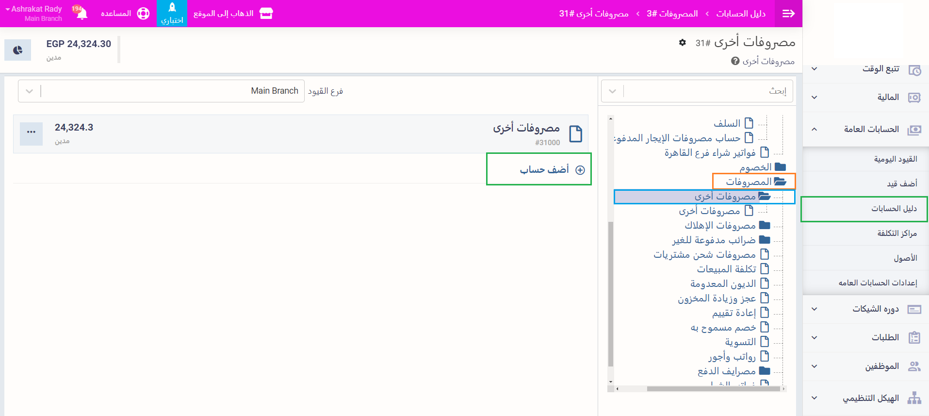 نقوم بإنشاء حساب جديد في دليل الحسابات لترصيد مصروفات الإيجارالمستقطعة شهريًا من إجمالي قيمة المصروفات المستحقة مقدمًا، اضغط على “دليل الحسابات” المنسدل عن “الحسابات العامة” بالقائمة الرئيسية ثم اضغط على “المصروفات” ثم “مصروفات أخرى” ثم اضغط على “+ أضف حساب”.