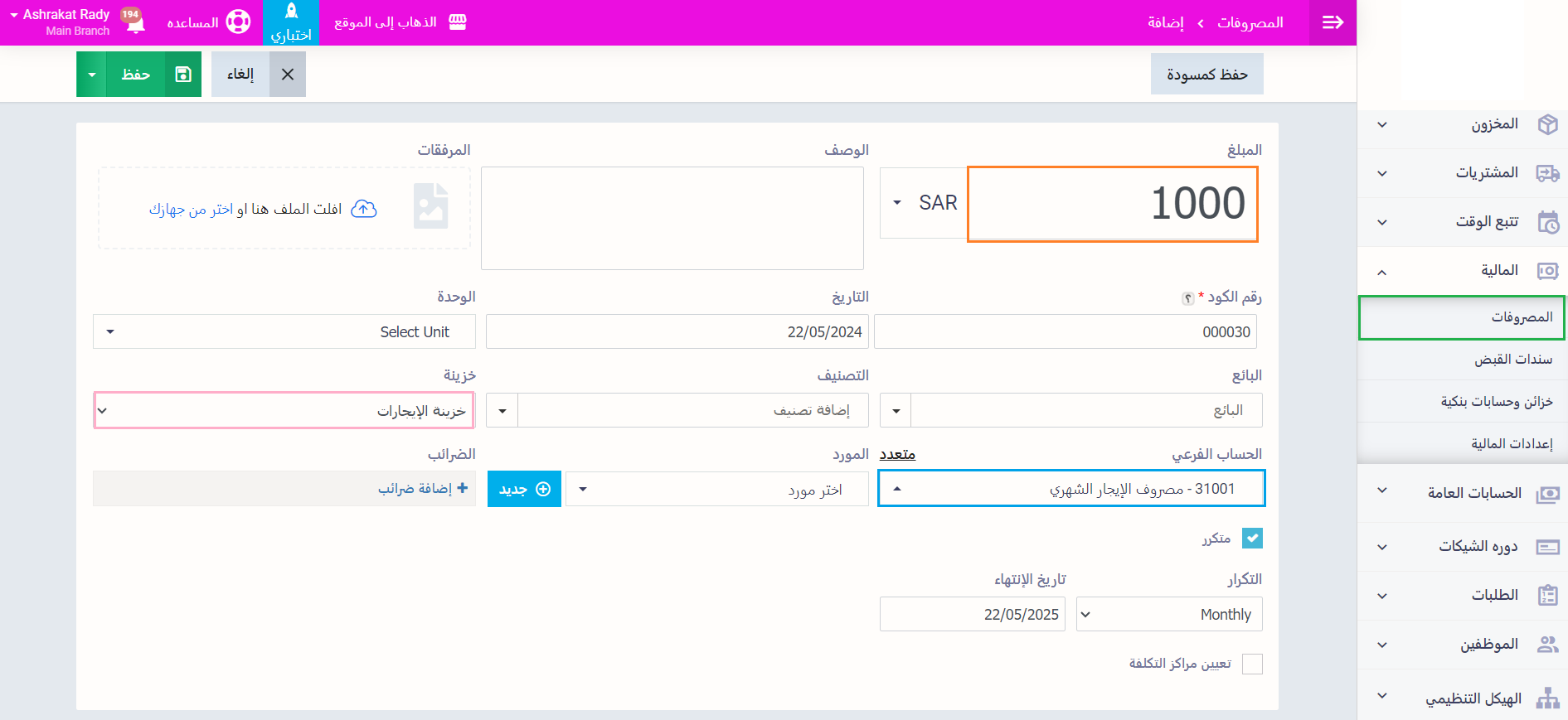 اضغط على “المصروفات” المنسدلة عن “المالية” بالقائمة الرئيسية ثم اضغط على “سند صرف”