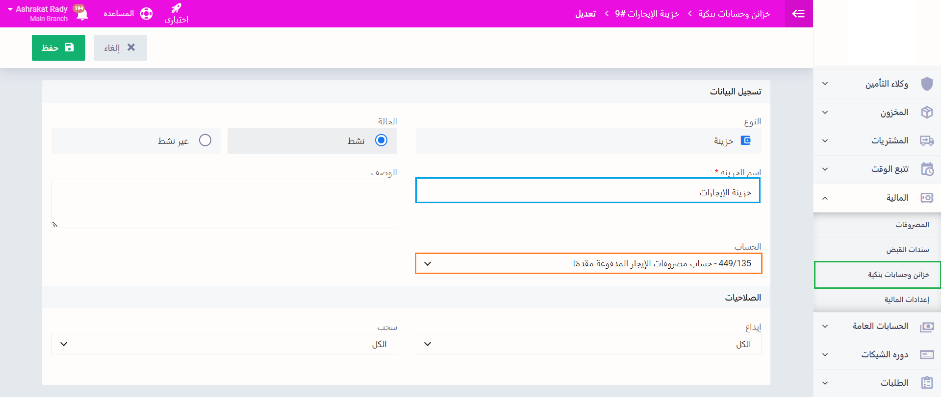 اضغط على “خزائن وحسابات بنكية” المنسدلة عن “المالية” بالقائمة الرئيسية واضغط على “إضافة خزينة”.