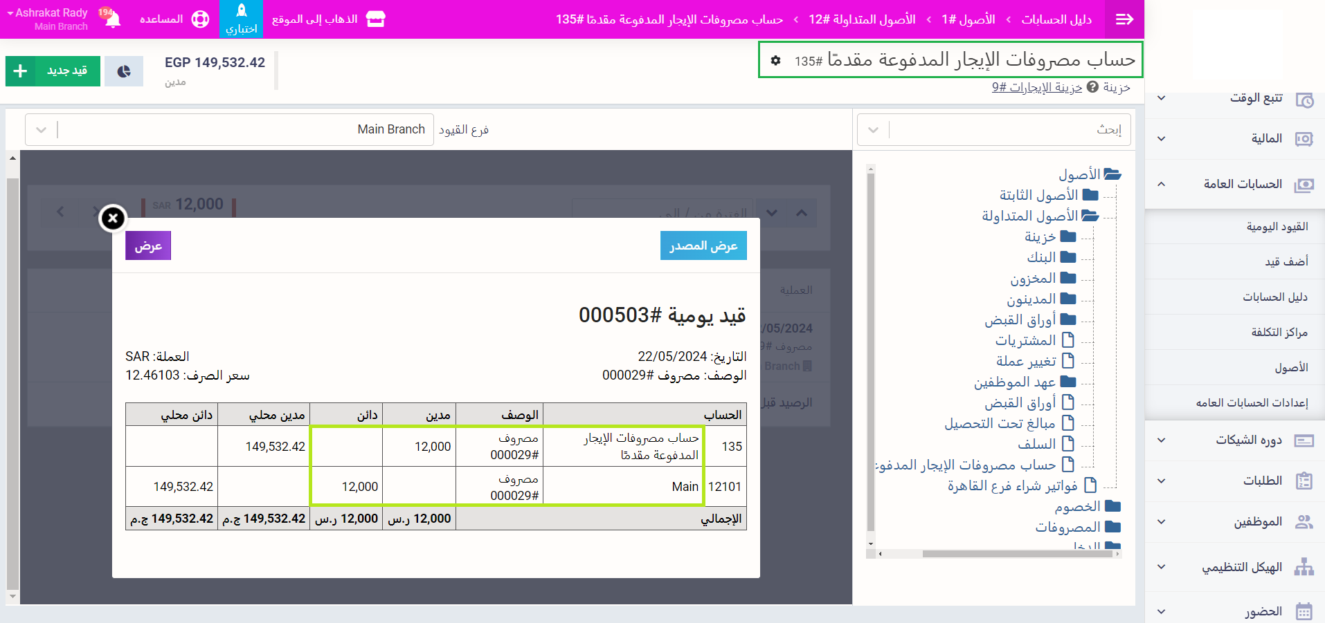 - واختر الخزينة “خزينة الإيجارات” أي الخزينة التي قمنا بربطها بحساب مصروفات الإيجار المدفوعة مقدمًا