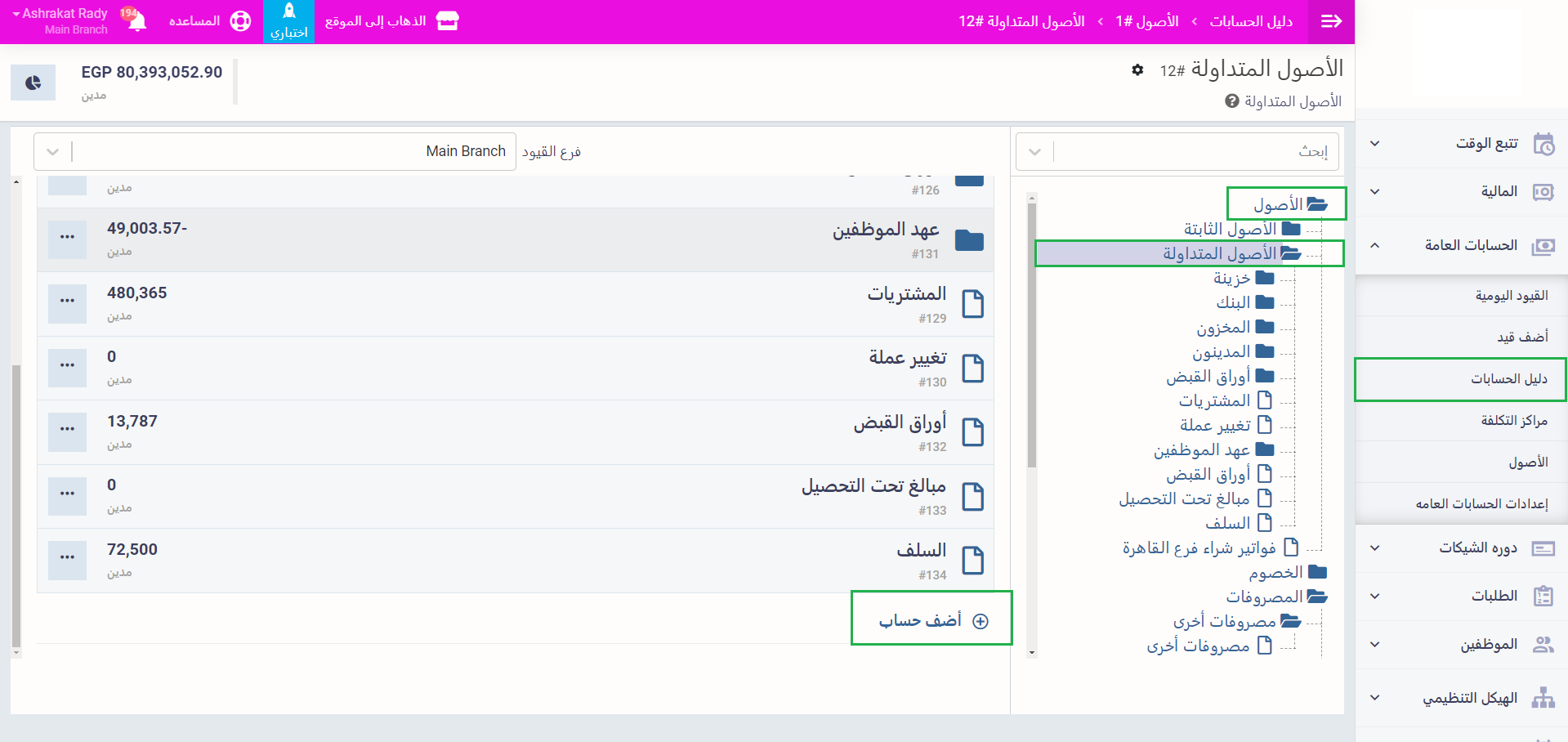 في البداية نقوم بإنشاء حساب جديد في دليل الحسابات لترصيد مصروفات الإيجار المدفوعة مقدمة داخله، اضغط على “دليل الحسابات” المنسدلة عن “الحسابات العامة” في دفترة ثم اضغط على “الأصول” ثم “الأصول المتداولة” ثم اضغط على “+ أضف حساب”.
