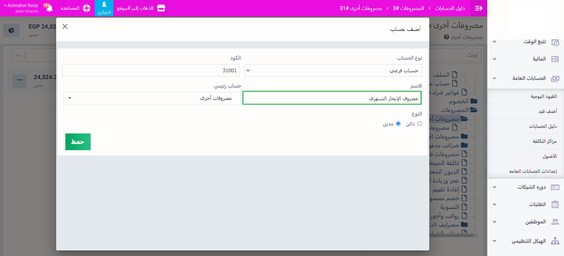 قم بإدخال اسم الحساب وليكن “مصروف الإيجار الشهري” ثم اضغط على زر “حفظ”.