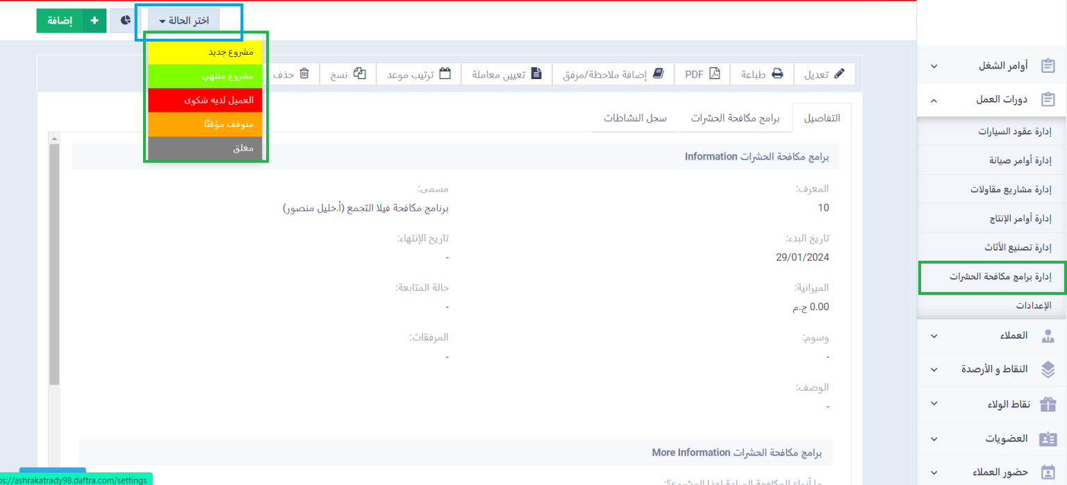 - الحالة يتم تمييزها بلون ويتم التحكم في حالتها من حيث النشاط ويمكنك استخدامها للبحث والفلترة