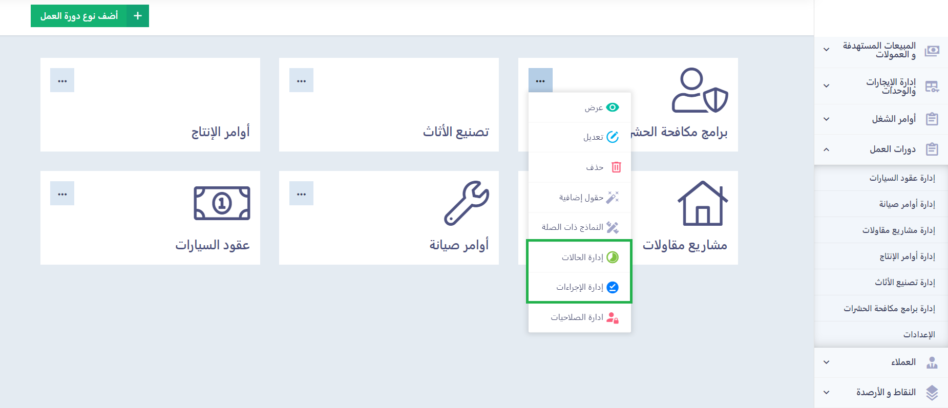 اضغط على الثلاث نقاط بجوار نوع دورة العمل المراد إضافة حالة أو إجراء لها، ثم اضغط على