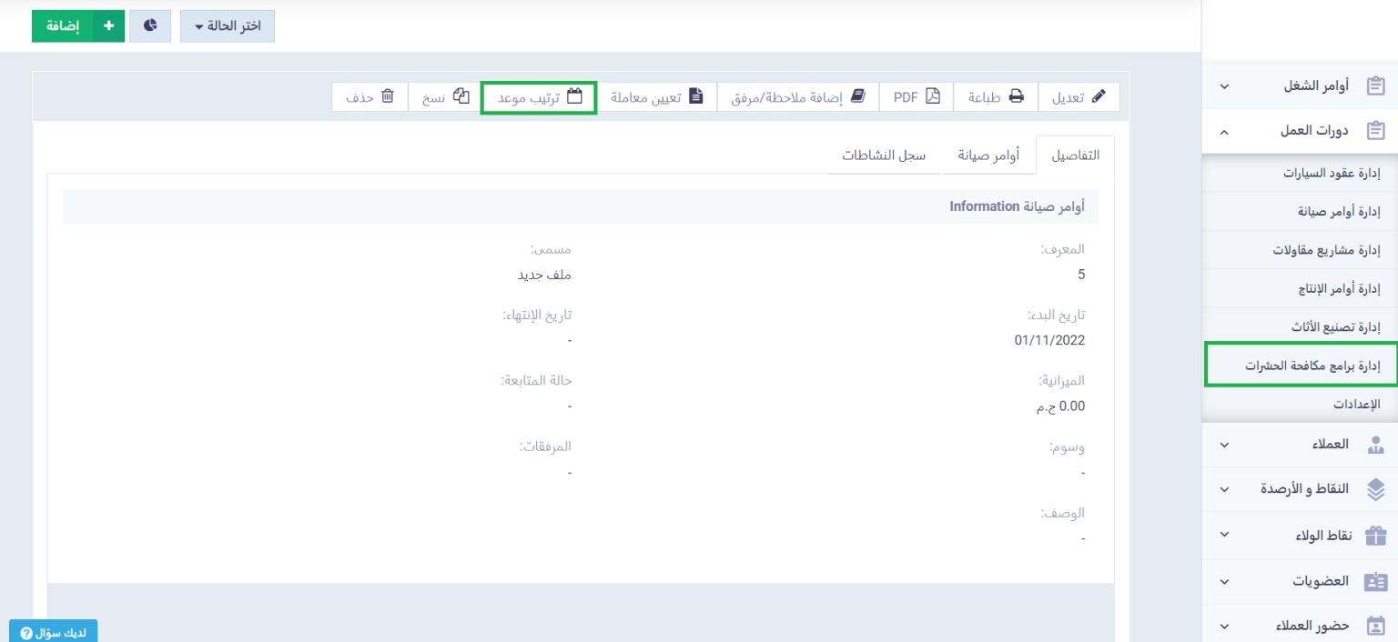 اضغط على نوع دورة العمل المراد إضافة حالة لأحد مستنداتها من القائمة الجانبية المنسدلة عن “دورات العمل” بالقائمة الرئيسية، واضغط على مستند دورة العمل المراد تعيين حالة له، ثم اضغط على “ترتيب موعد”