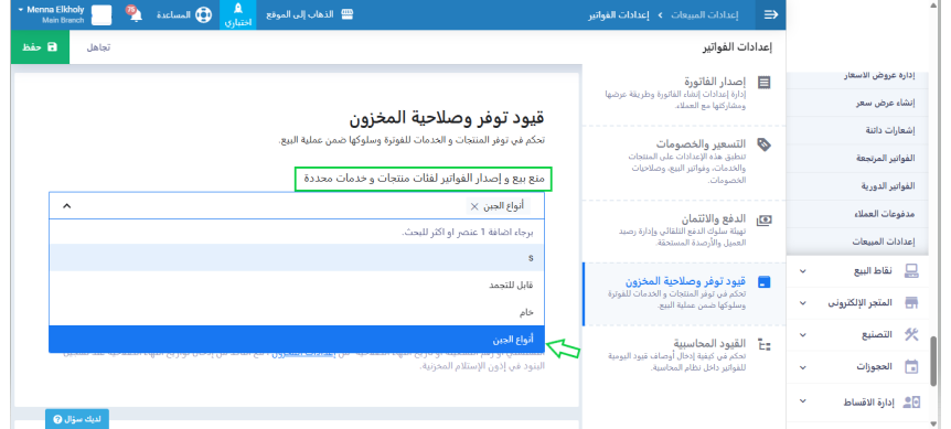 اضغط على “إعدادات المبيعات” المنسدلة عن “المبيعات” بالقائمة الرئيسية ثم اضغط على “إعدادات الفواتير” واختر التصنيف المراد استبعاده من هذا الفرع باختياره من القائمة المنسدلة عن “منع بيع و إصدار الفواتير لفئات منتجات و خدمات محددة” ثم اضغط على زر “حفظ”.