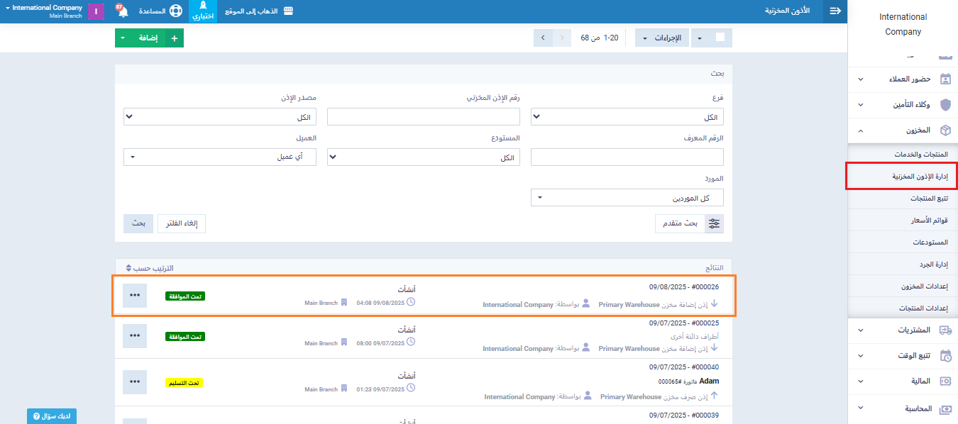 في حال رغبتك في حذف الكميات التي تمت إضافتها عبر الملف الذي قمت برفعه، أو حتى حذف المنتجات نهائيًا، توجه إلى “إدارة الأذون المخزنية“، ثم اختر الإذن الذي أنشأه النظام تلقائيًا لإضافة كميات المنتجات المستوردة من ملف الإكسل.