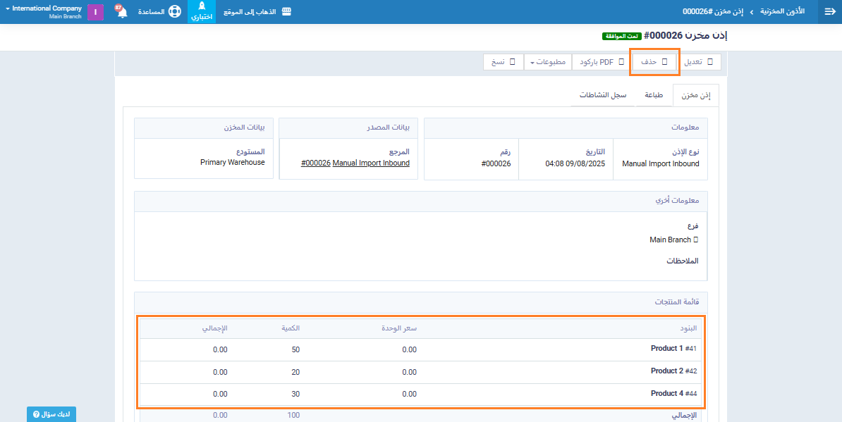 الآن، قم بحذف الإذن المخزني من خلال الضغط على زر “حذف“، ليتم إزالة الكميات المسجلة أو المنتجات المضافة عبر الملف بشكل نهائي من النظام.